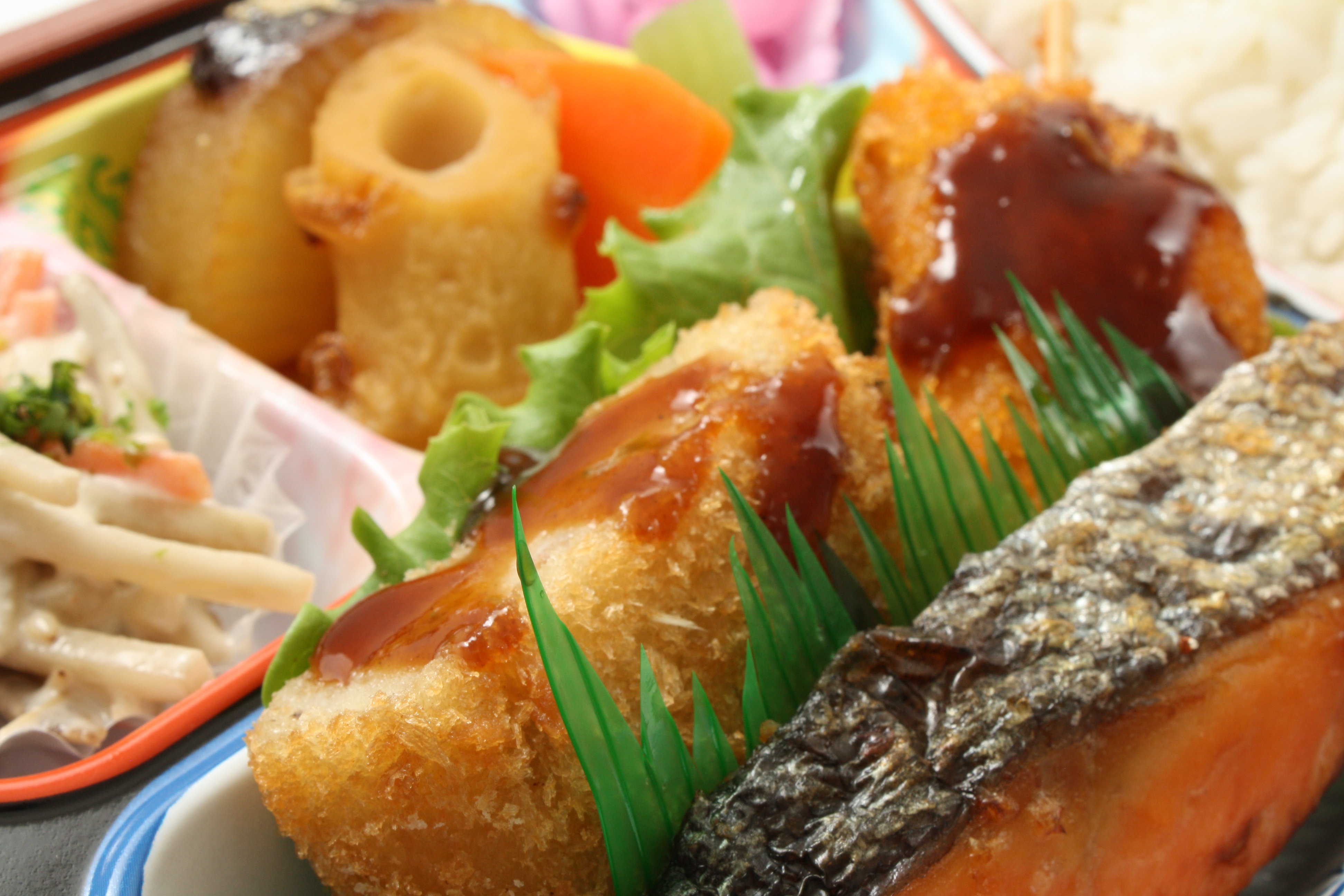 サケの塩焼き、コロッケ、串カツ、大根煮、人参、ちくわ煮、ふき、ゴボウサラダ、漬物、白御飯(高菜、ごま、梅干し)