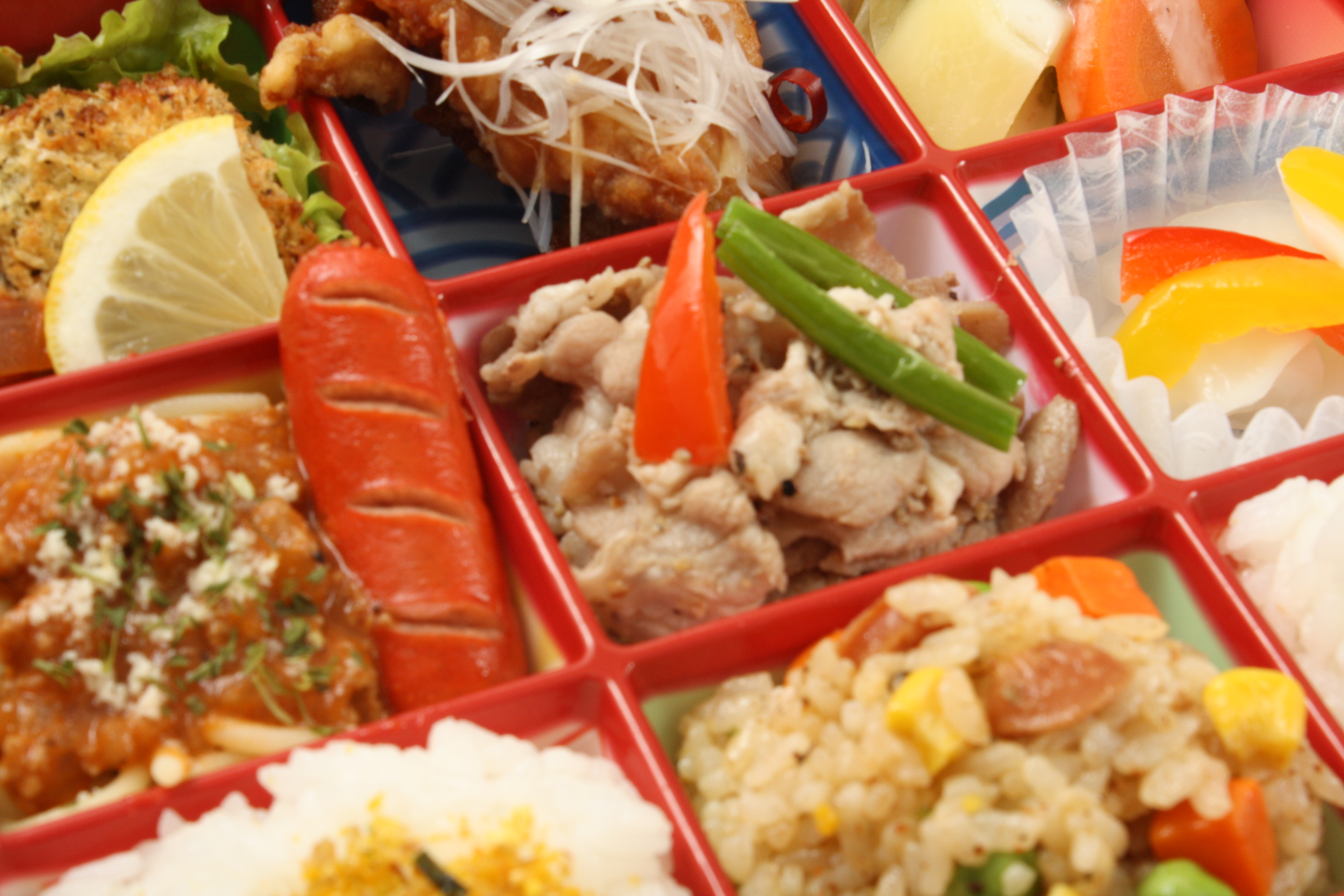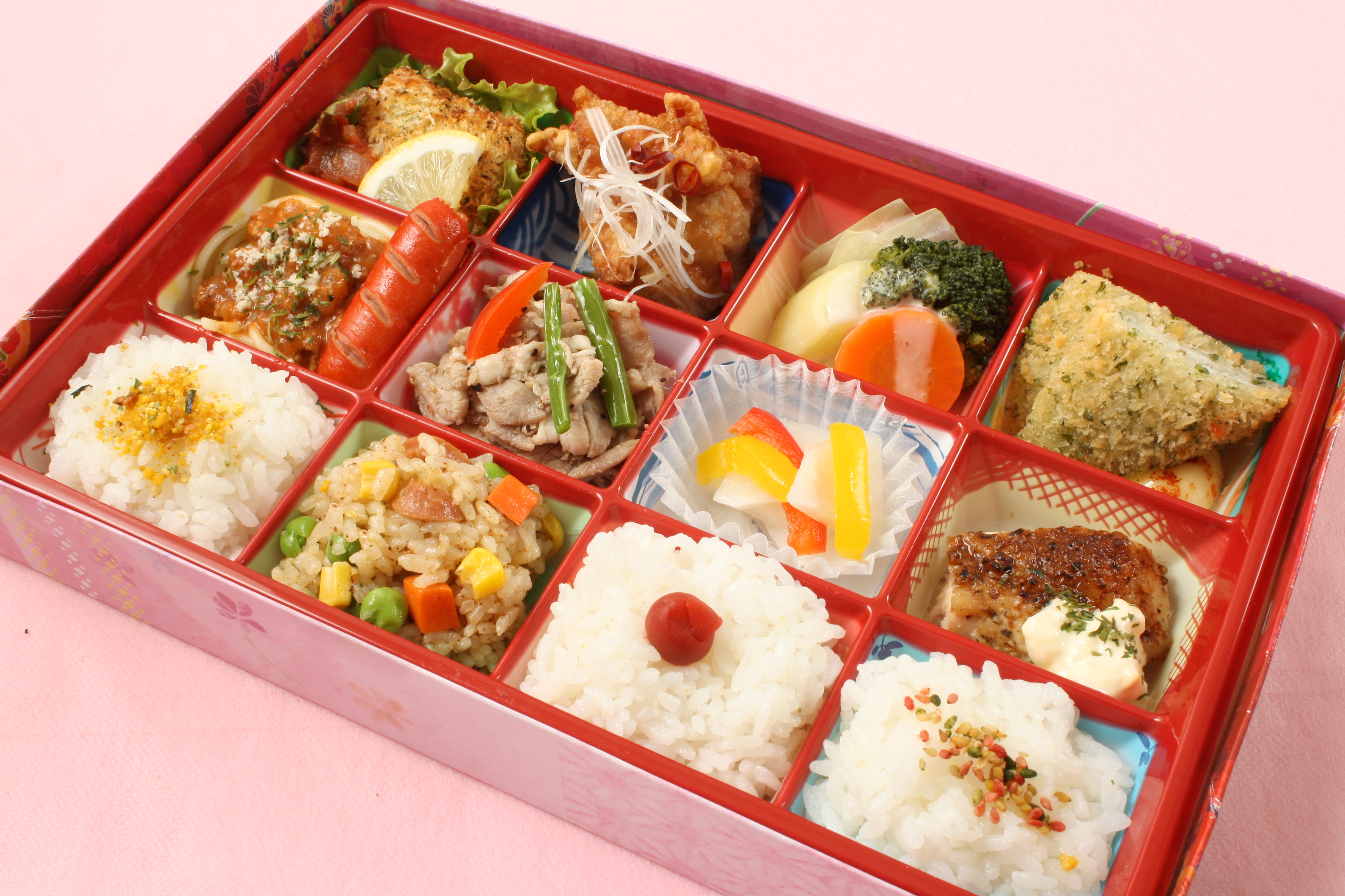 (1)白身魚の香草パン粉焼きトマトソース (2)鶏唐南蛮 (3)蒸し鶏野菜サラダシーザードレッシング (4)白身チーズ磯部フライマヨ (5)ミートスパゲティ、赤ウインナー (6)豚塩だれ焼肉 (7)カブとパプリカの甘酢和え (8)ケイジャンチキンタルタルソース (9)白ご飯(玉子ふりかけ) (10)ジャンパラヤ (11)白ご飯(梅干し) (12)白ご飯(彩善胡麻)