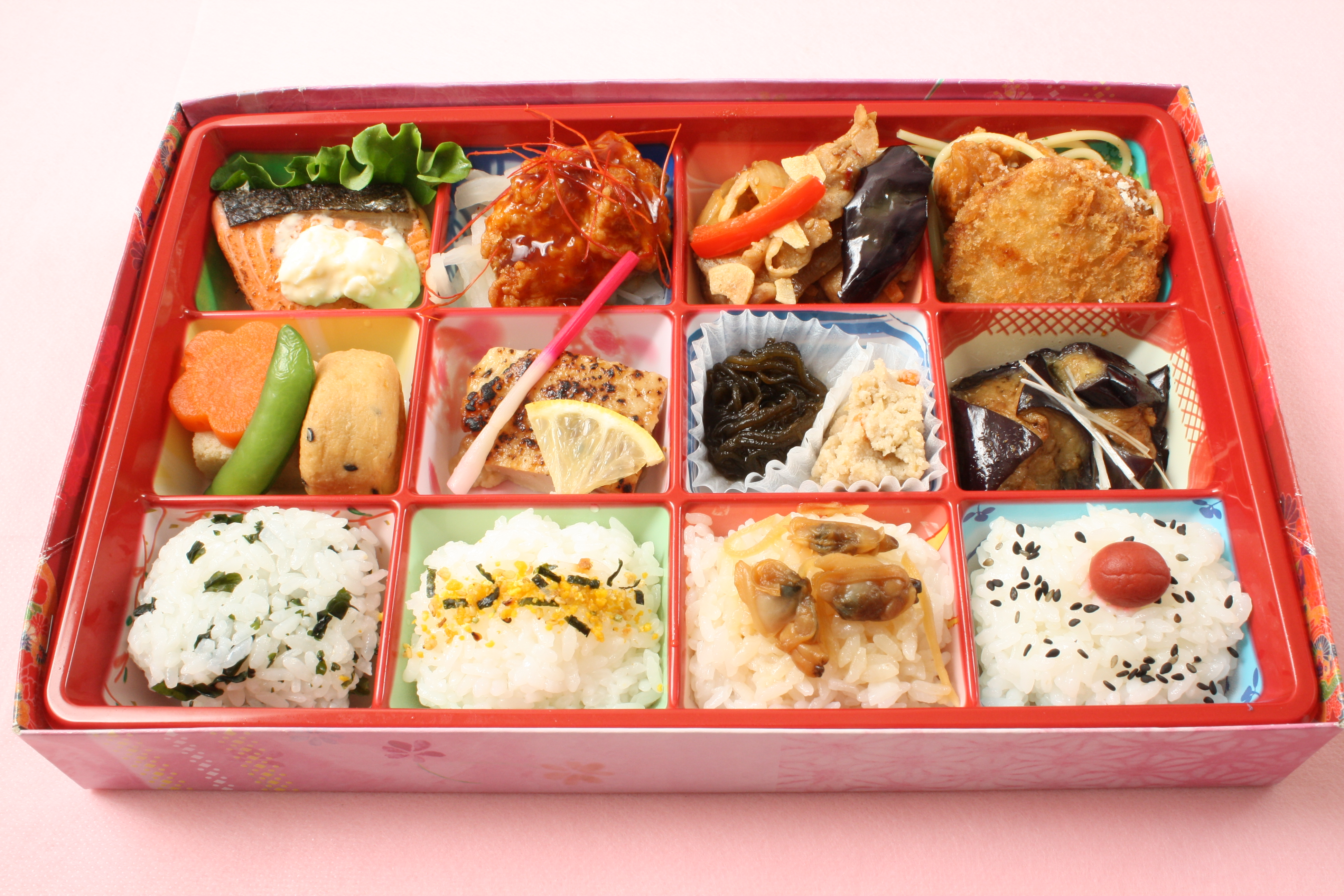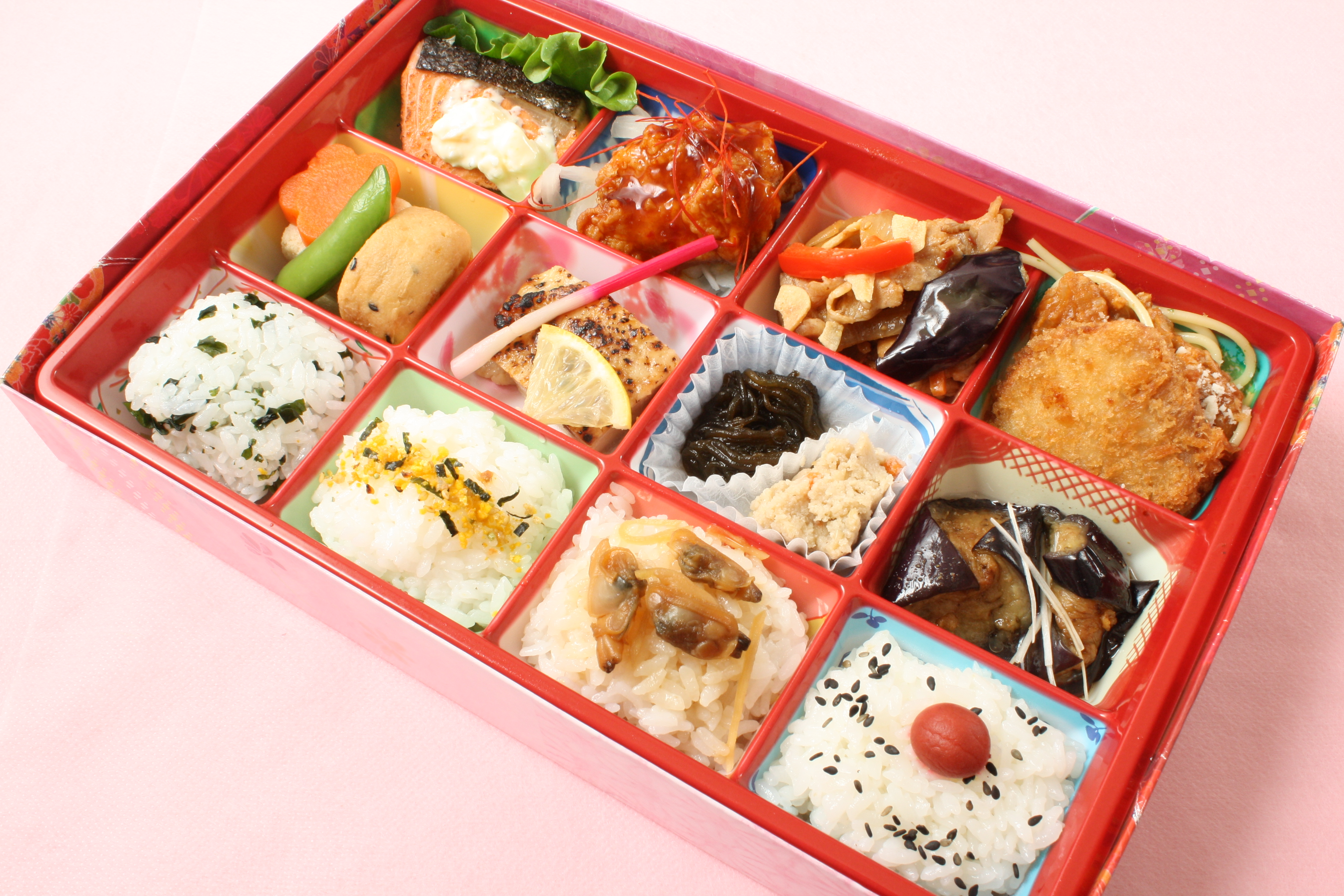 (1)サーモンポシュ (2)ヤンニョムチキン (3)豚スタミナ焼き (4)ミートスパゲティ、パルメザンチーズ、ヘレカツ (5)煮炊き物(高野豆腐、ヒロウス、花人参、スナップ) (6)最強チキン (7)もずく、雪花菜 (8)茄子山椒 (9)わかめご飯 (10)白ご飯(ふりかけ) (11)あさりご飯 (12)白ご飯(胡麻、梅)